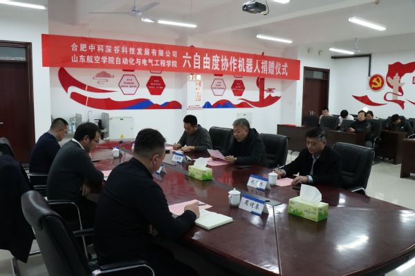 12月4日,我校自动化与电气工程学院在11号教学楼313会议室举行合肥中科深谷科技发展有限公司六自由度协作机器人捐赠仪式。学校党委委员、副校长刘宝民出席仪式并致辞,合作发展处处长赵书杰人代表学校接受捐赠并向企业颁发捐赠证书。合肥中科深谷科技发展有限公司副总经理潘超、山东分部负责人周健春,山东大学机器人研究中心主任助理李国梁出席仪式,我校自动化与电气工程学院负责人及教师代表参加仪式。